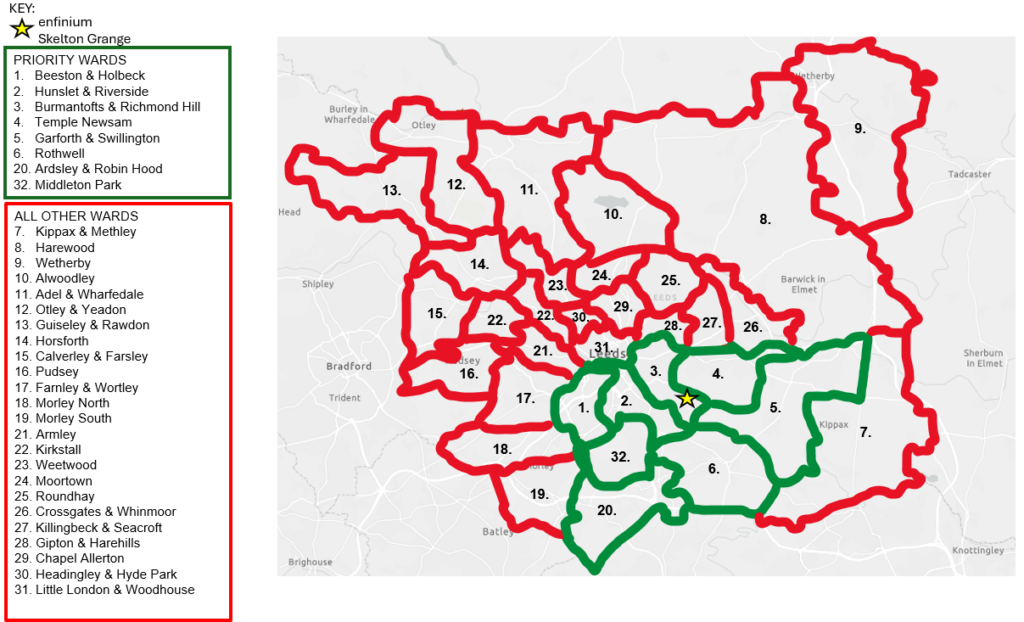 We are currently accepting applications from the below wards in the Leeds City metropolitan area, prioritising those within the eight closest wards (as shown in green below).